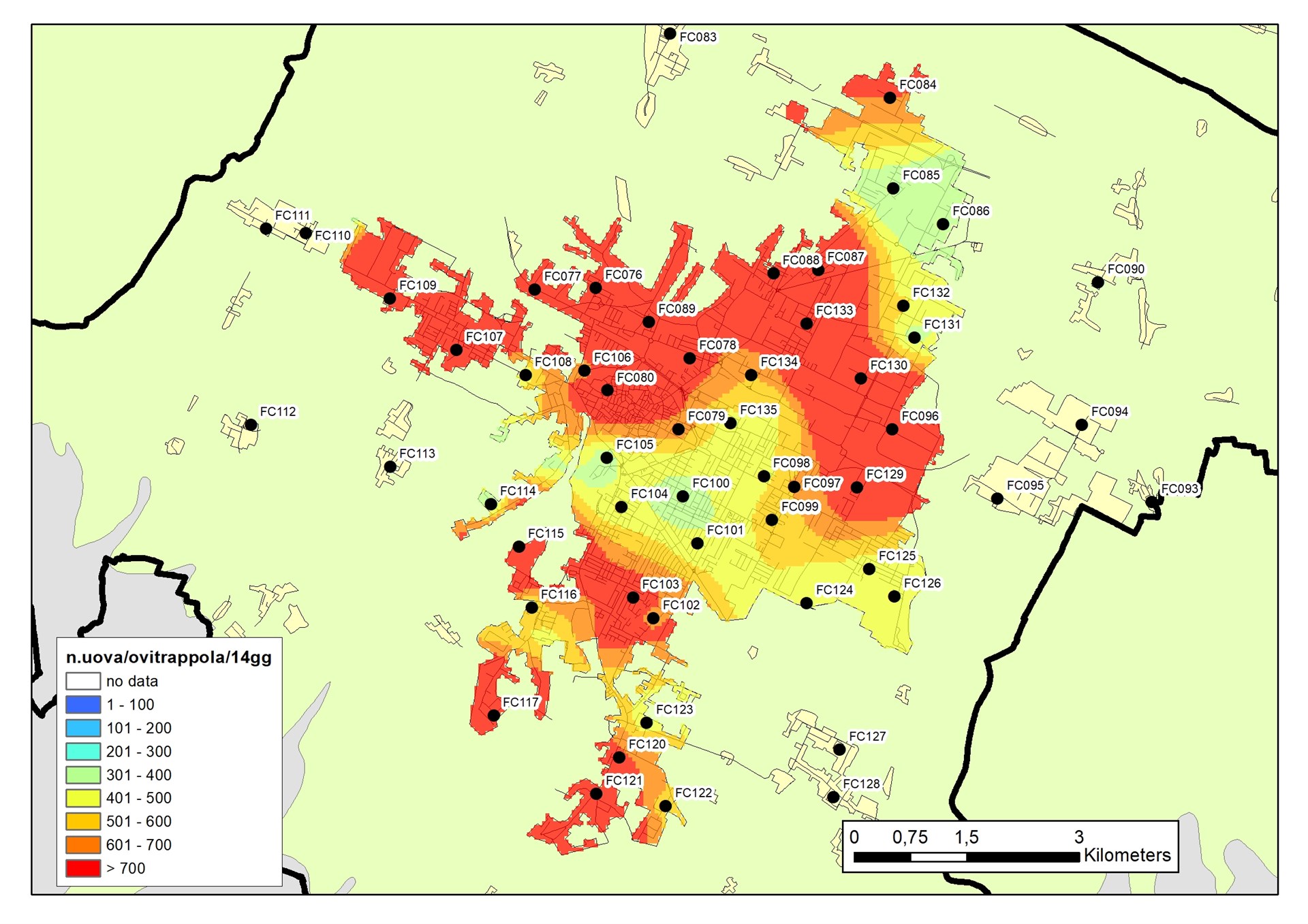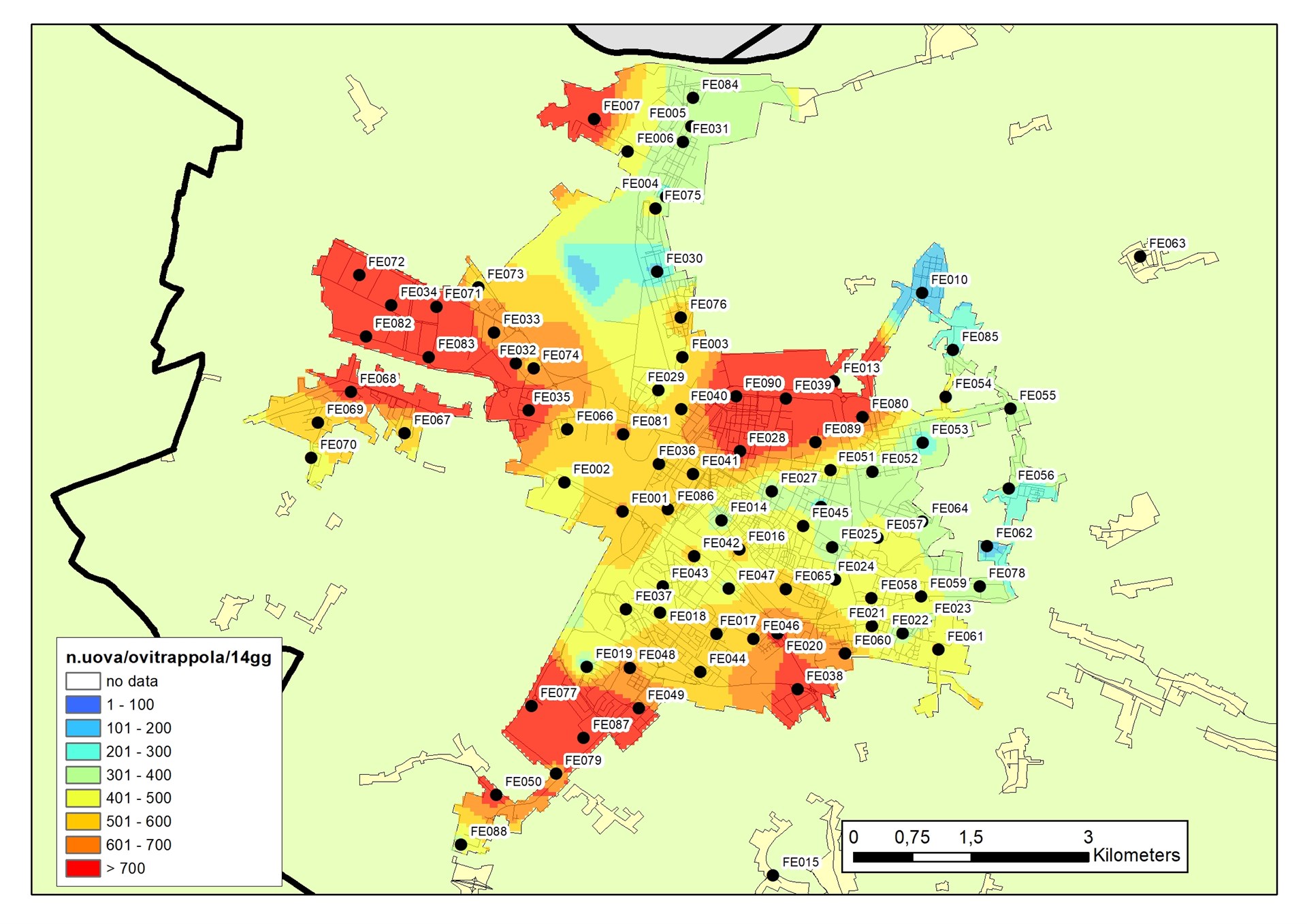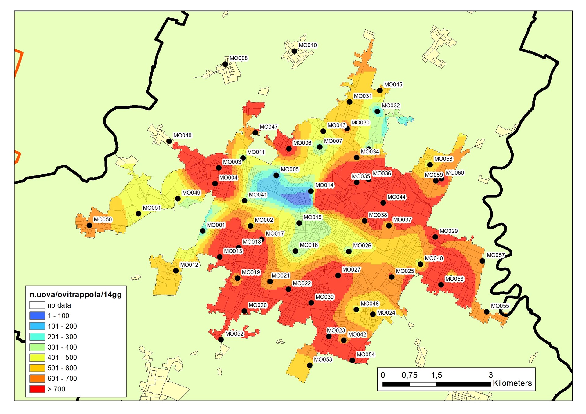Utilizzando i dati delle ovitrappole vengono create mappe di distribuzione mensili da Giugno a Settembre per i 10 Comuni capoluogo sottoposti al monitoraggio della Zanzara Tigre.