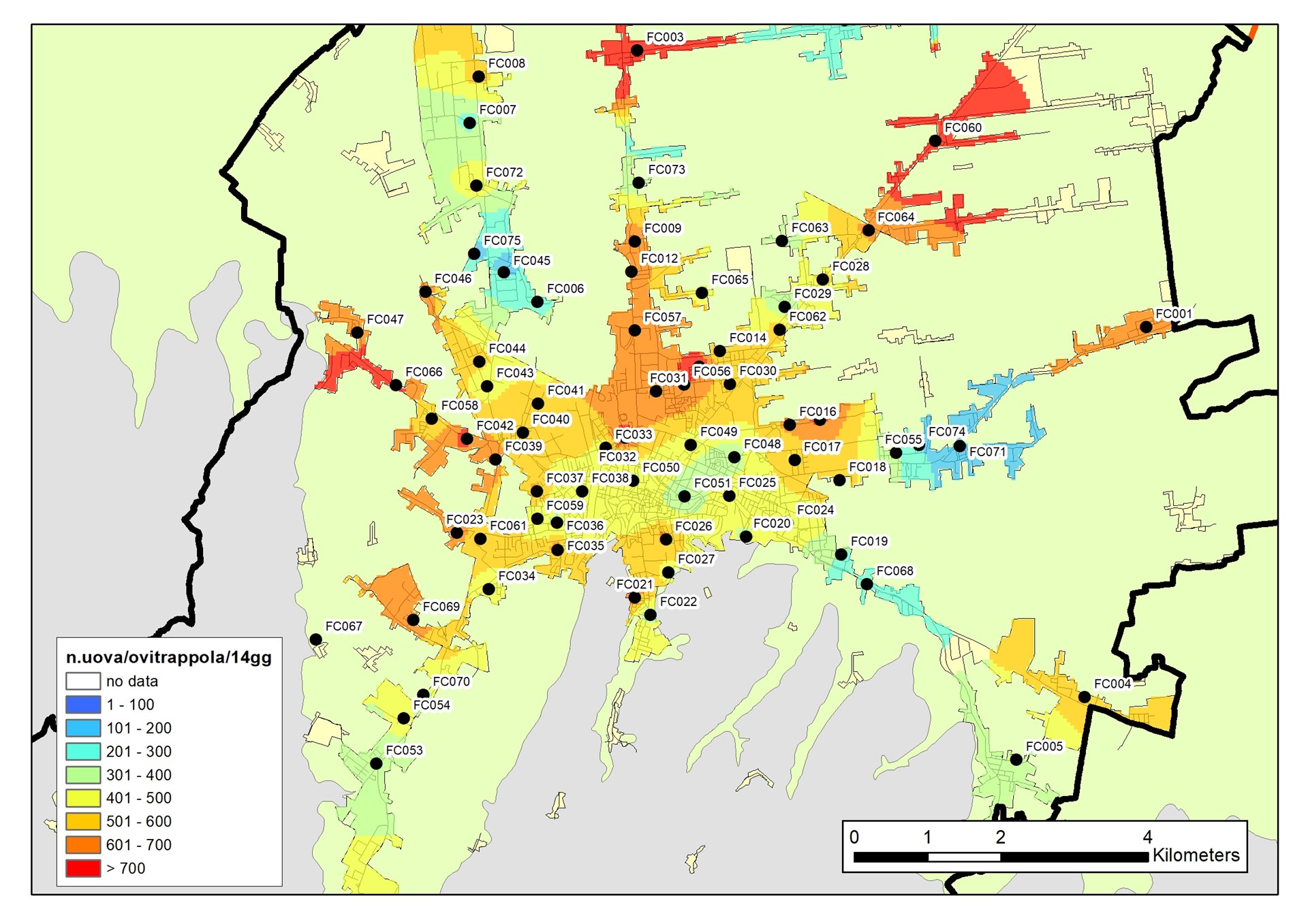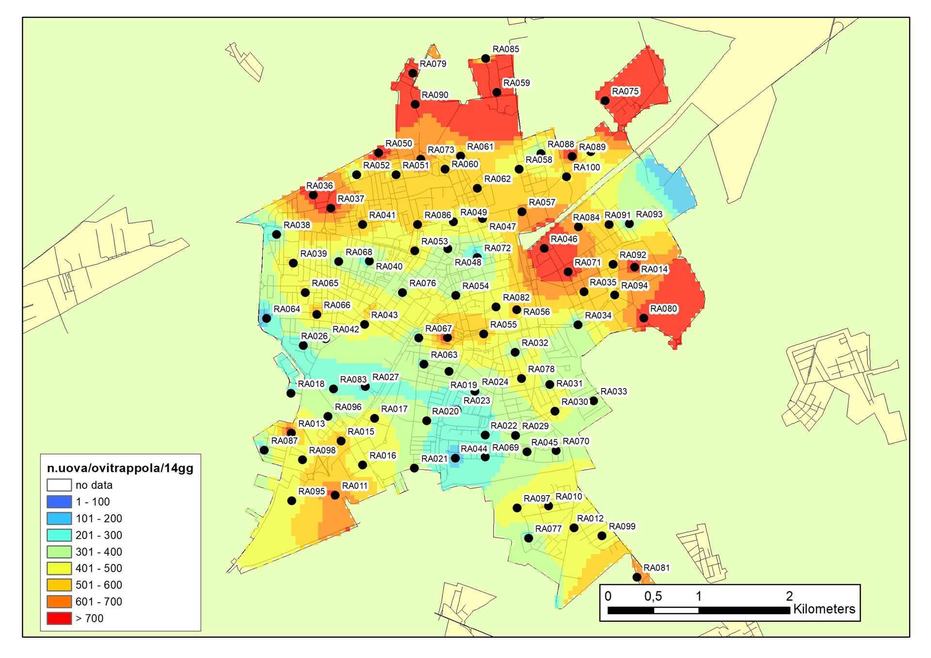 Nelle mappe mensili prodotte vengono evidenziate con il colore rosso le aree a maggiore densità della specie (> 700 uova/ovitrappola/14gg) in cui i Comuni possono investire maggiori risorse sia economiche che umane per la lotta (es. attività Porta-a-Porta, sopralluoghi mirati, attività di maggiore comunicazione, banchetti informativi, ecc.) in quanto tali aree risultano con alta probabilità essere non solo zone in cui la molestia della specie è più elevata, ma anche zone in cui il rischio di trasmissione di arbovirus quali Dengue, Chikungunya e Zika è più probabile qualora vengano introdotti accidentalmente.